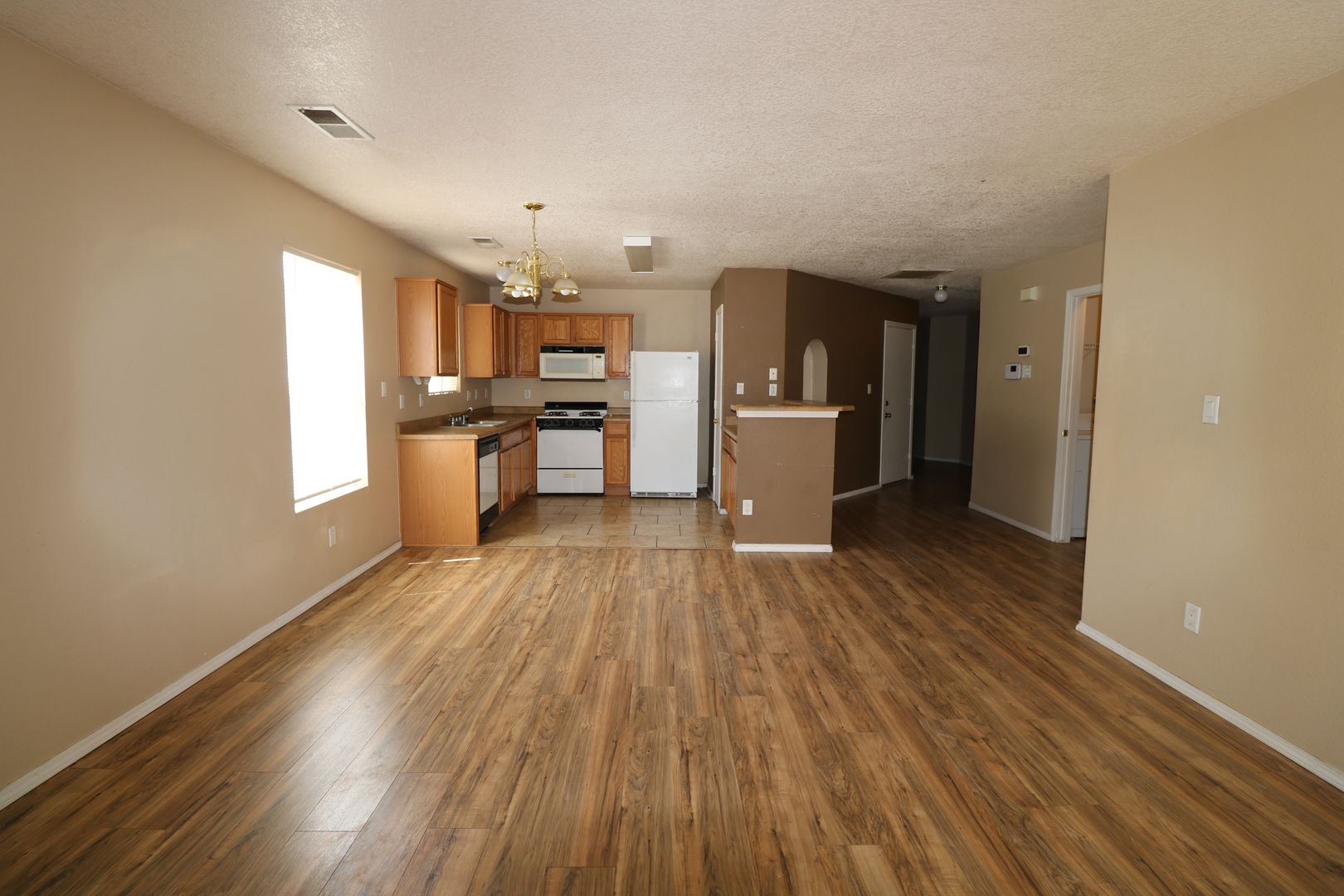 3BR, 2BA, 2CG, Refrigerator, Dishwasher, Gas stove, Washer/Dryer in property. Wood in living room, Tile in kitchen, carpet in bedrooms. Open floor plan. Xeriscaped front and backyard