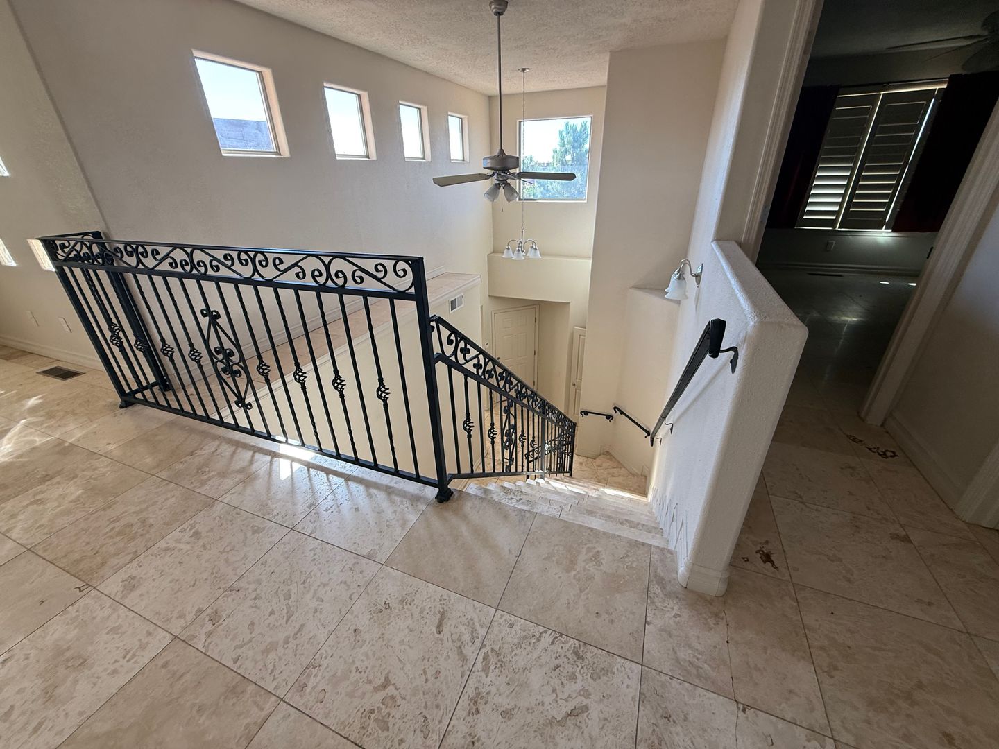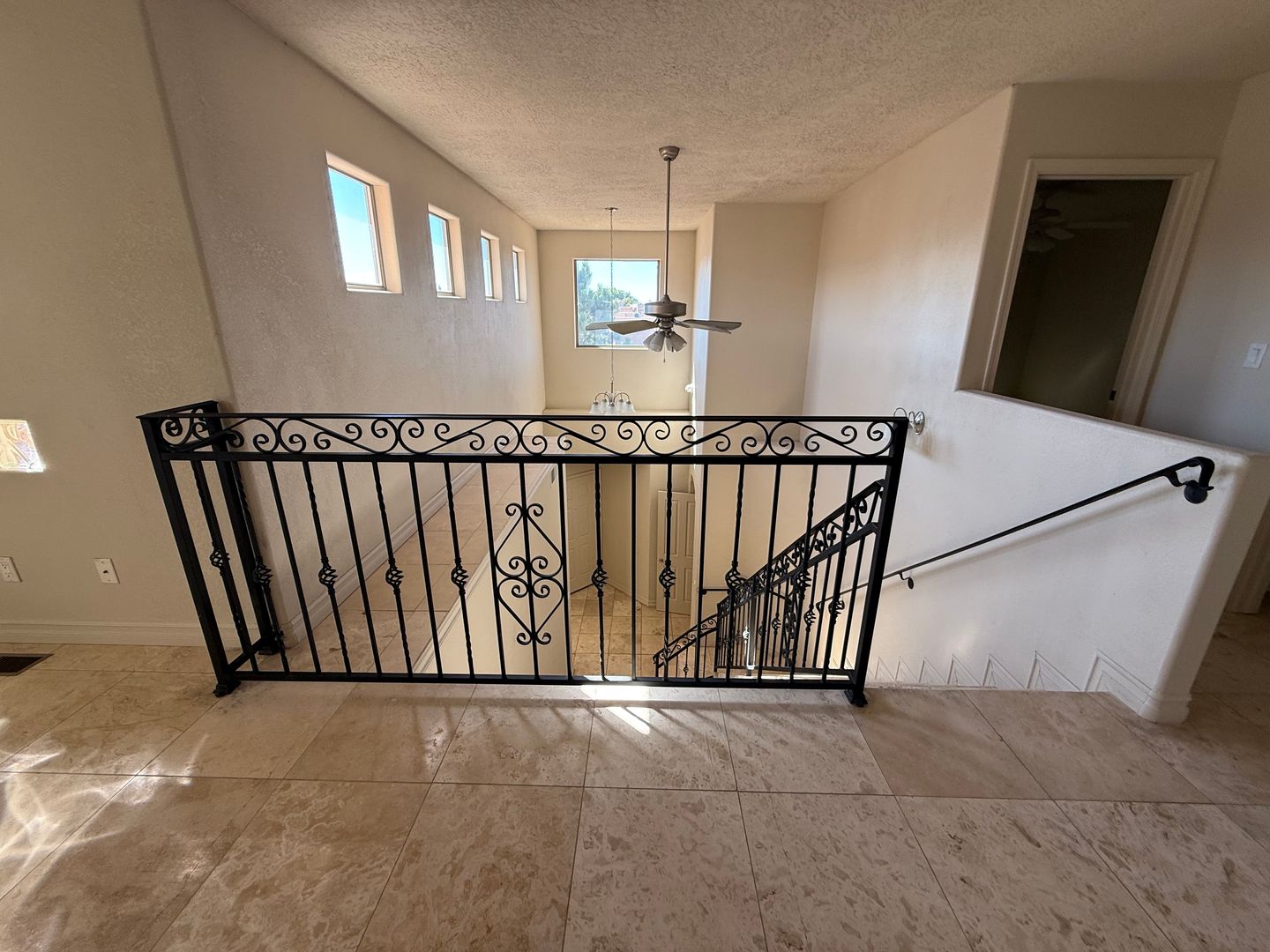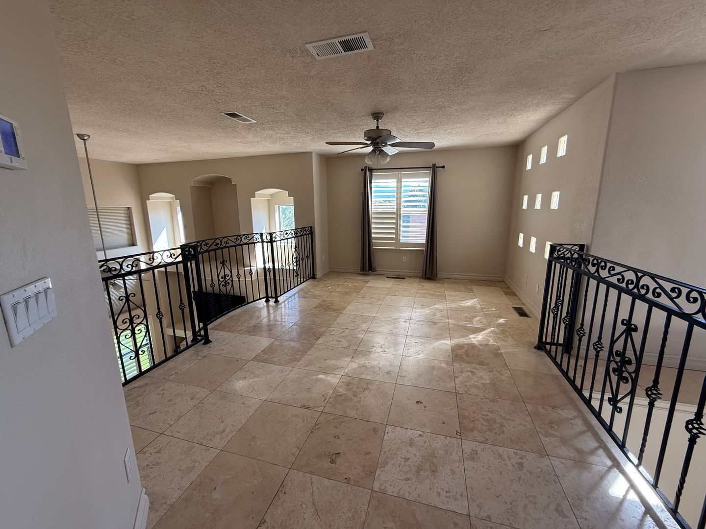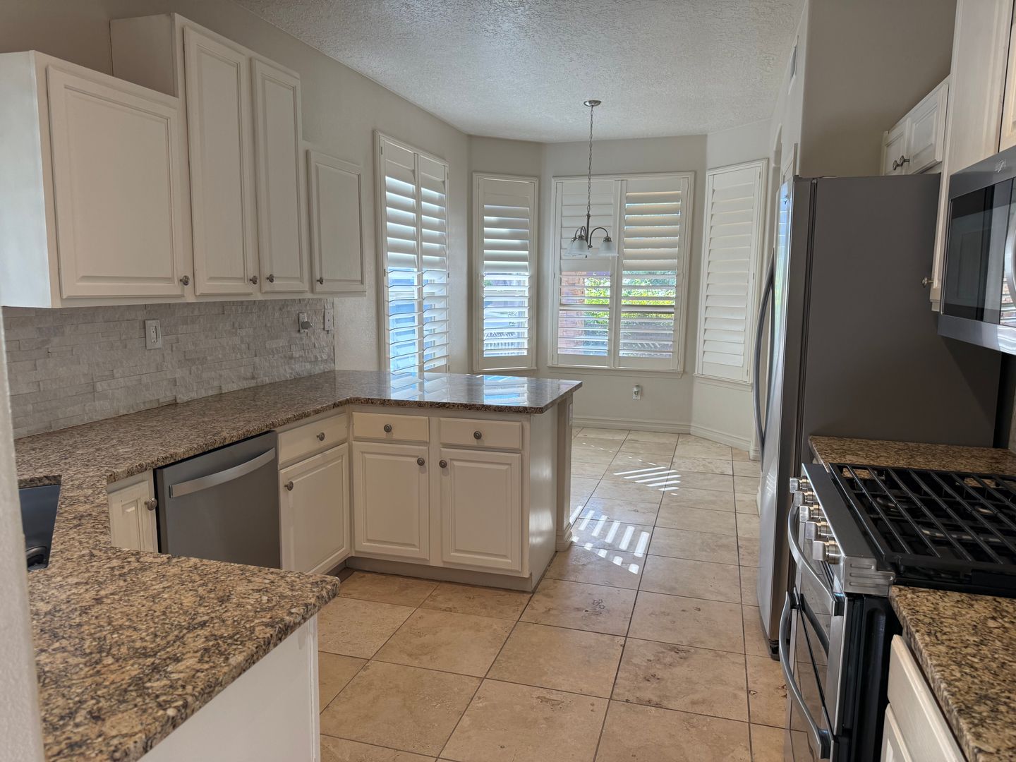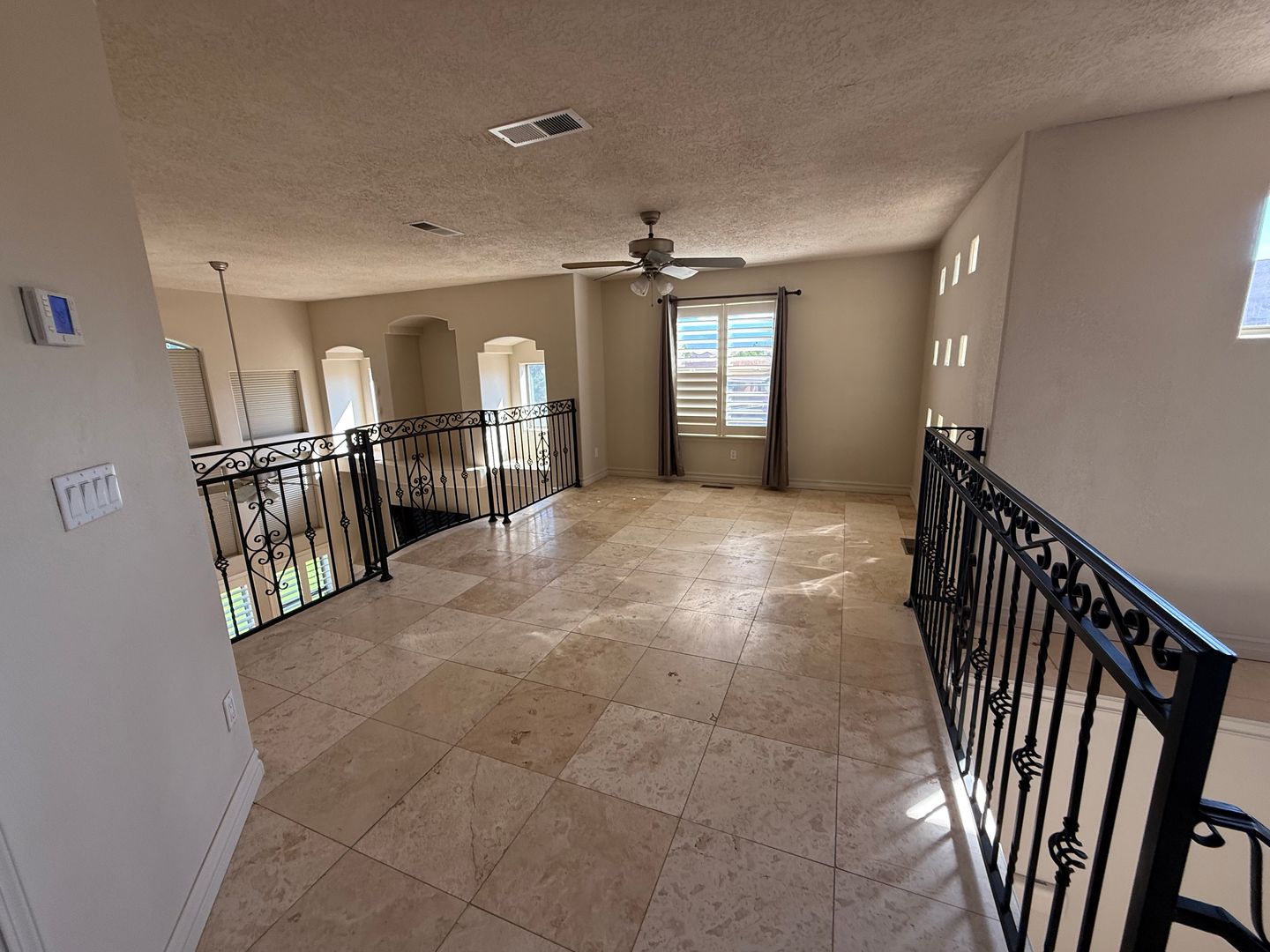 This home offers 2,105 square feet of living space, featuring 3 bedrooms and 3 bathrooms. Notable amenities include tile flooring throughout, a beautiful wrought iron staircase leading to an upstairs loft, and granite countertops in both the kitchen and bathrooms. The outdoor area is equipped with turf. There is a separate formal dining area, and the living room offers a custom gas fireplace and raised ceilings. The primary suite is located on the first floor and includes a private bath with a large vanity, a garden tub, a walk-in shower, and a walk-in closet. Two guest bedrooms are also located upstairs.