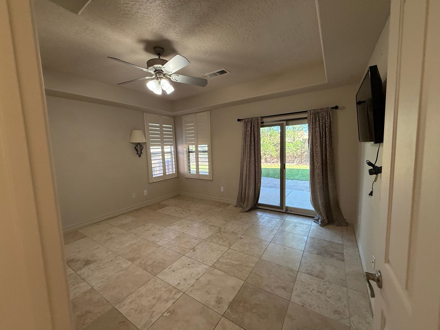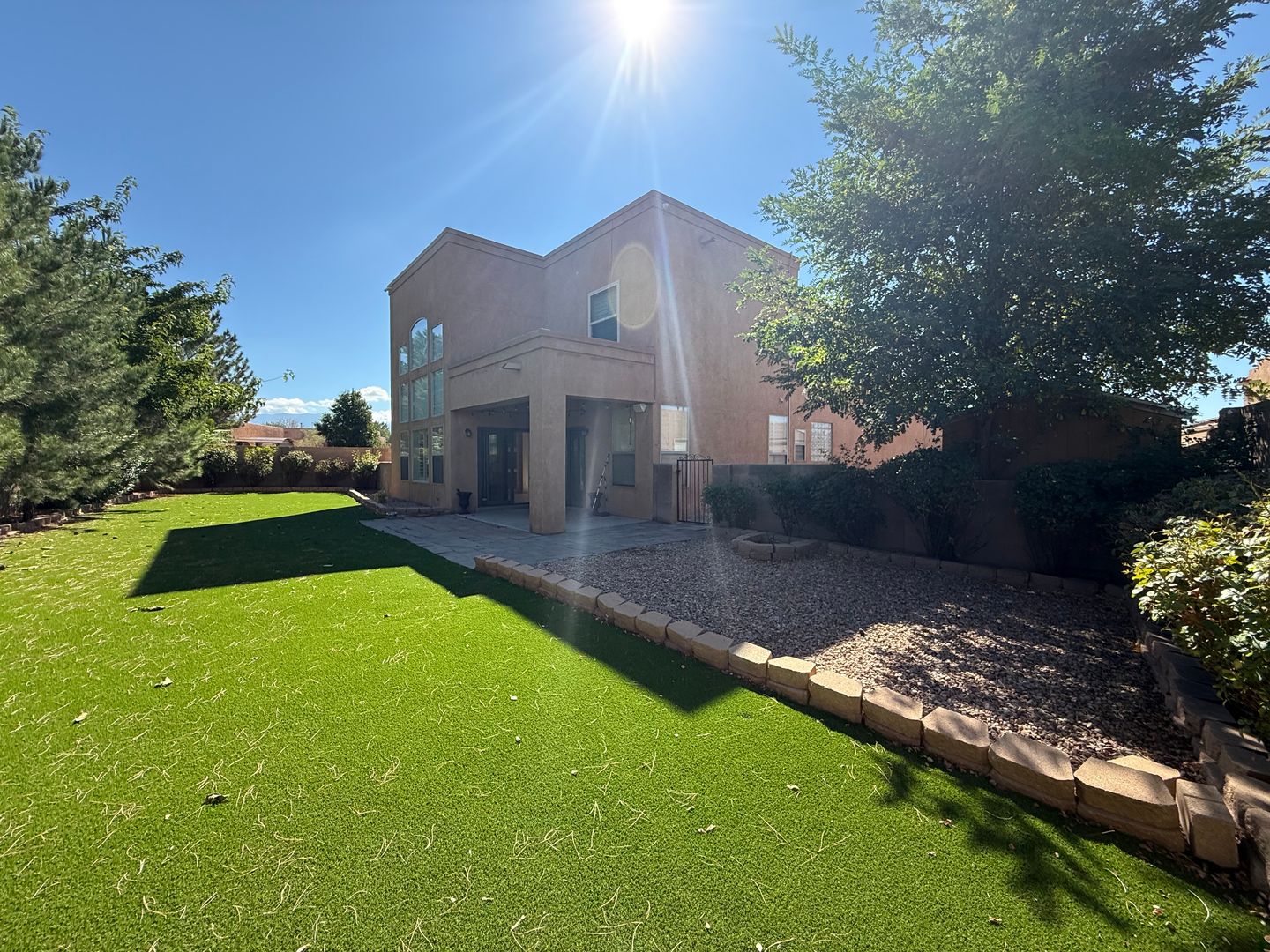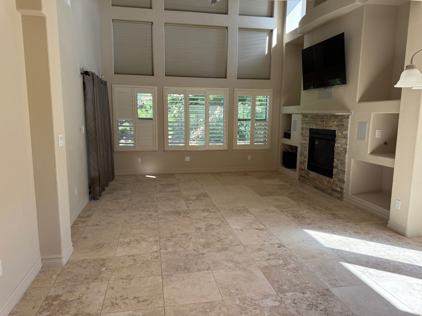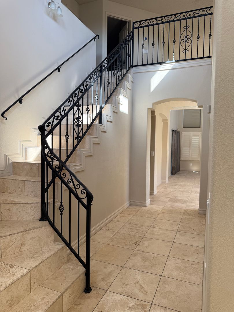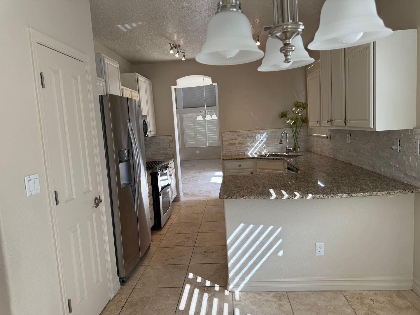 This home offers 2,105 square feet of living space, featuring 3 bedrooms and 3 bathrooms. Notable amenities include tile flooring throughout, a beautiful wrought iron staircase leading to an upstairs loft, and granite countertops in both the kitchen and bathrooms. The outdoor area is equipped with turf. There is a separate formal dining area, and the living room offers a custom gas fireplace and raised ceilings. The primary suite is located on the first floor and includes a private bath with a large vanity, a garden tub, a walk-in shower, and a walk-in closet. Two guest bedrooms are also located upstairs.