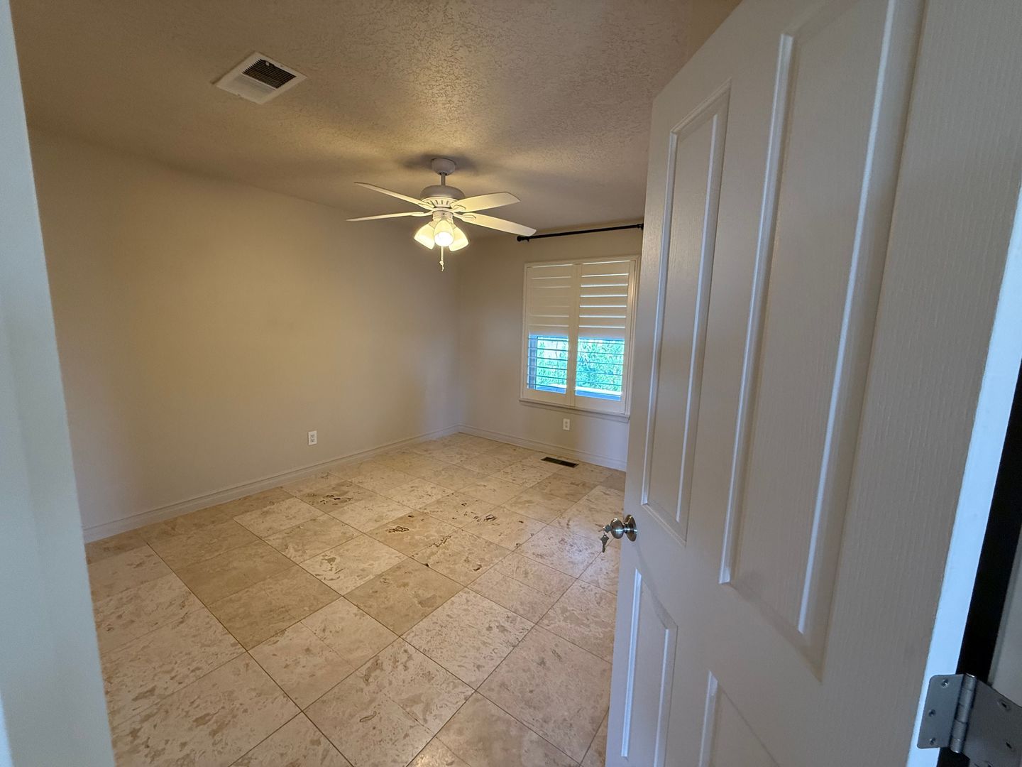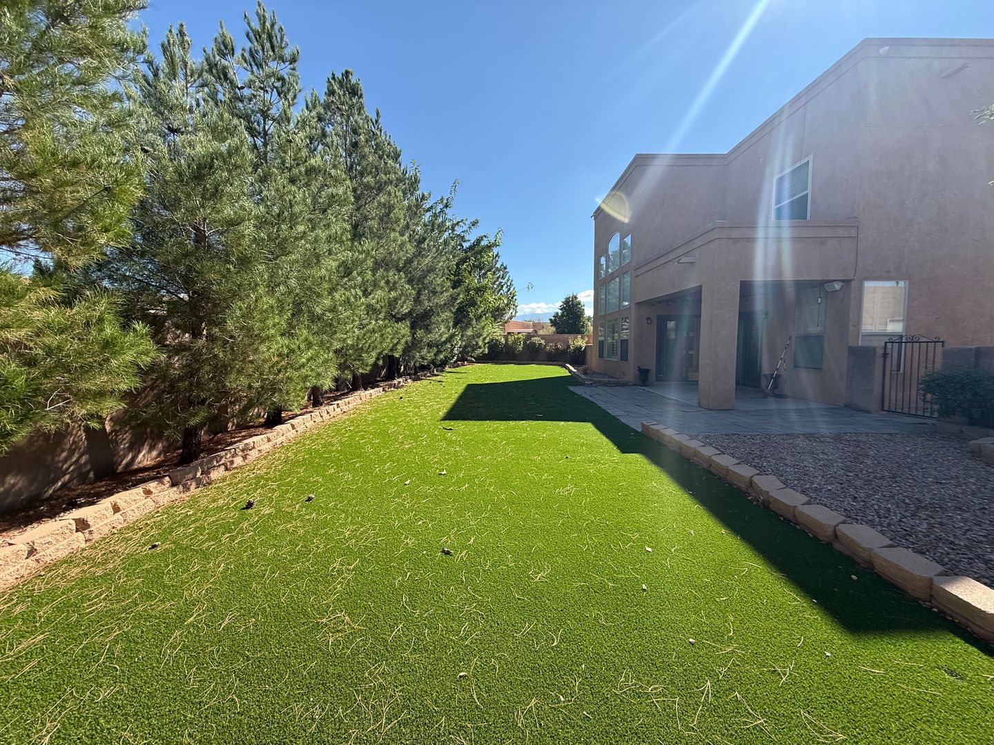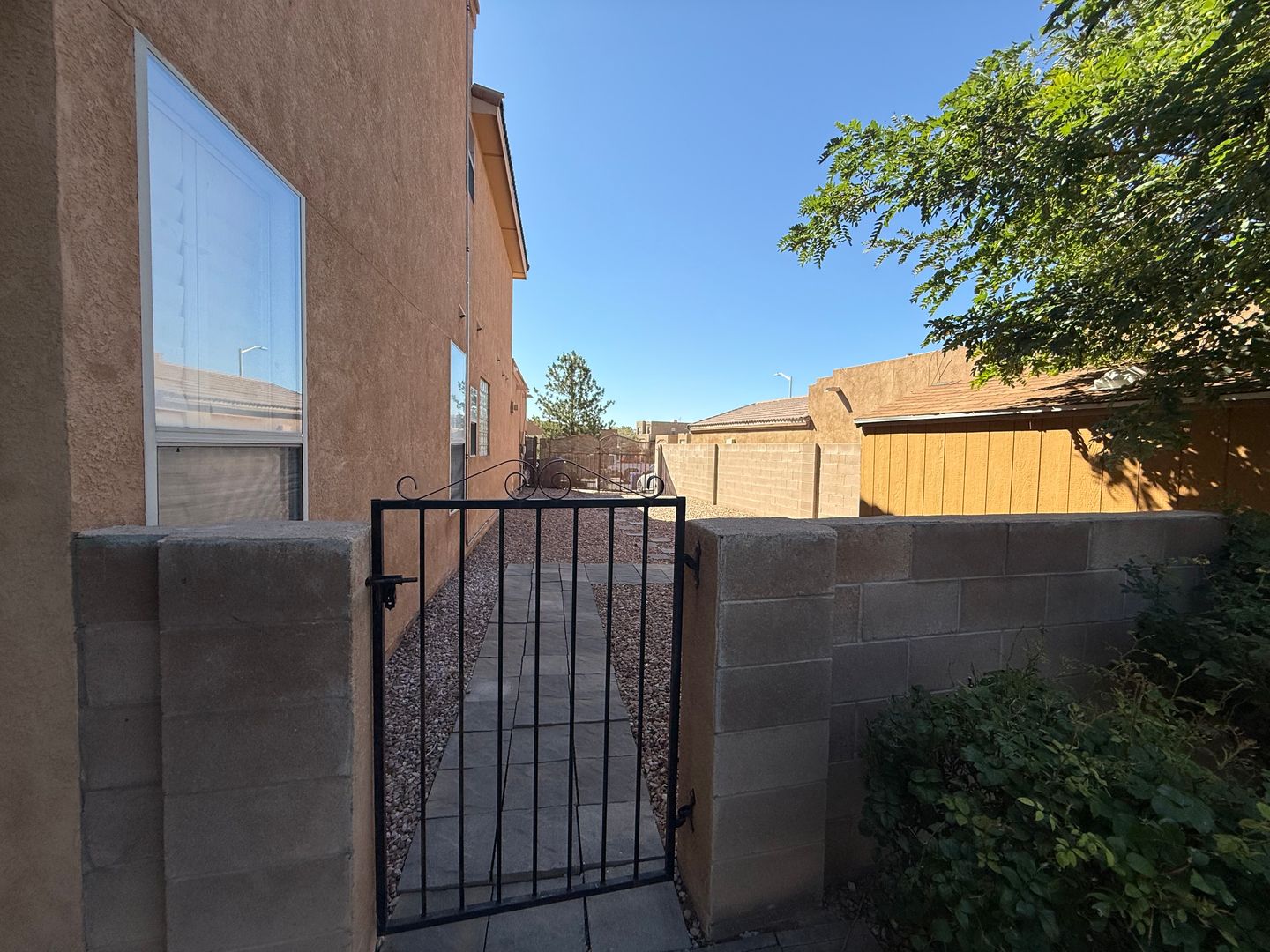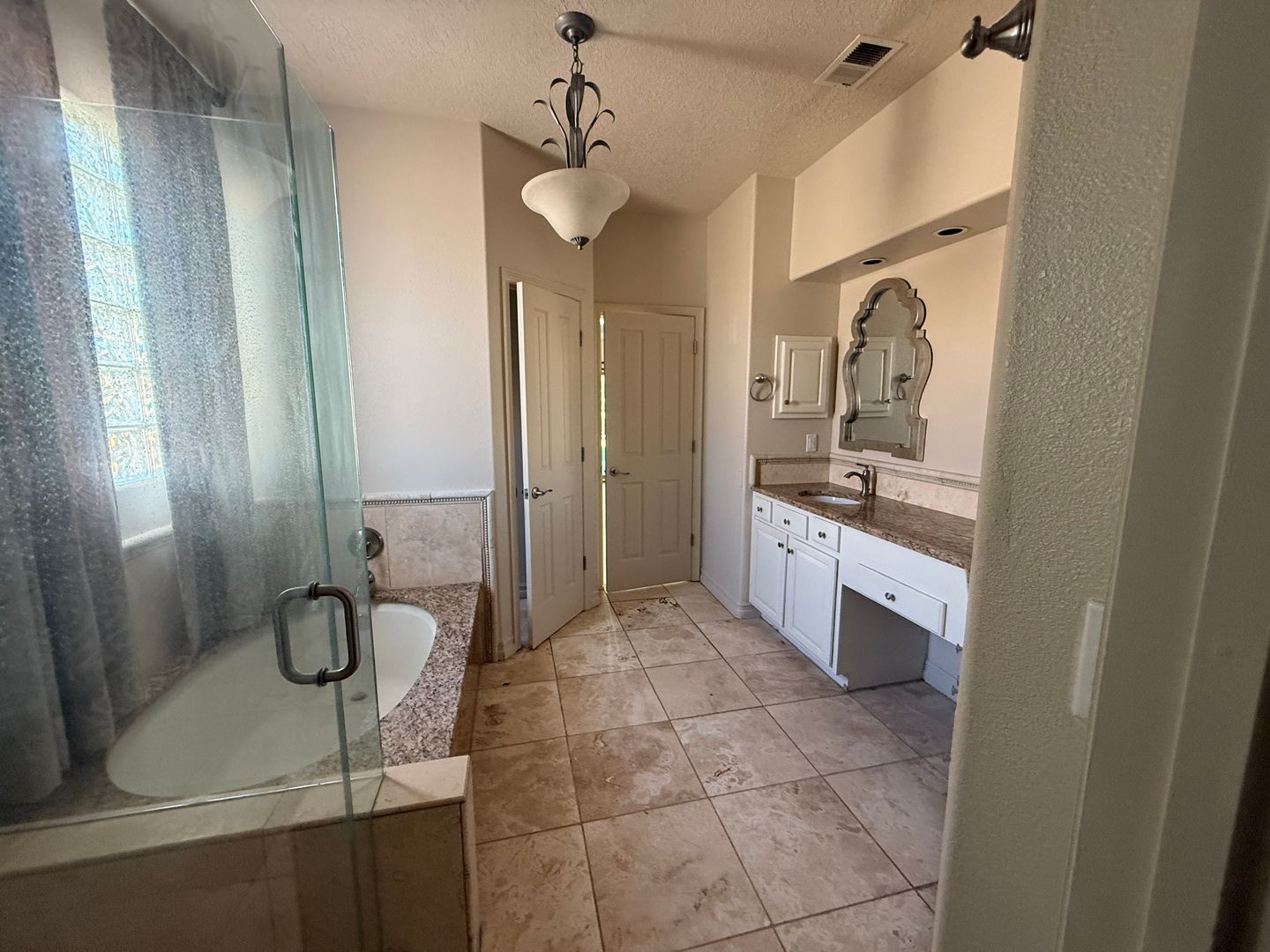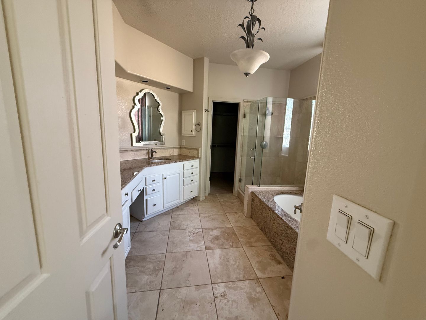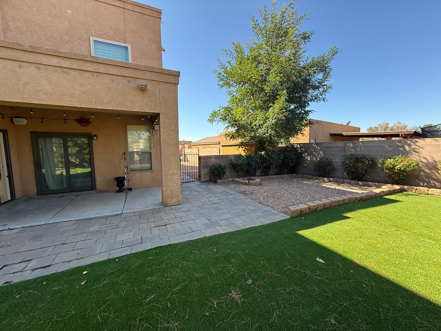 This home offers 2,105 square feet of living space, featuring 3 bedrooms and 3 bathrooms. Notable amenities include tile flooring throughout, a beautiful wrought iron staircase leading to an upstairs loft, and granite countertops in both the kitchen and bathrooms. The outdoor area is equipped with turf. There is a separate formal dining area, and the living room offers a custom gas fireplace and raised ceilings. The primary suite is located on the first floor and includes a private bath with a large vanity, a garden tub, a walk-in shower, and a walk-in closet. Two guest bedrooms are also located upstairs.