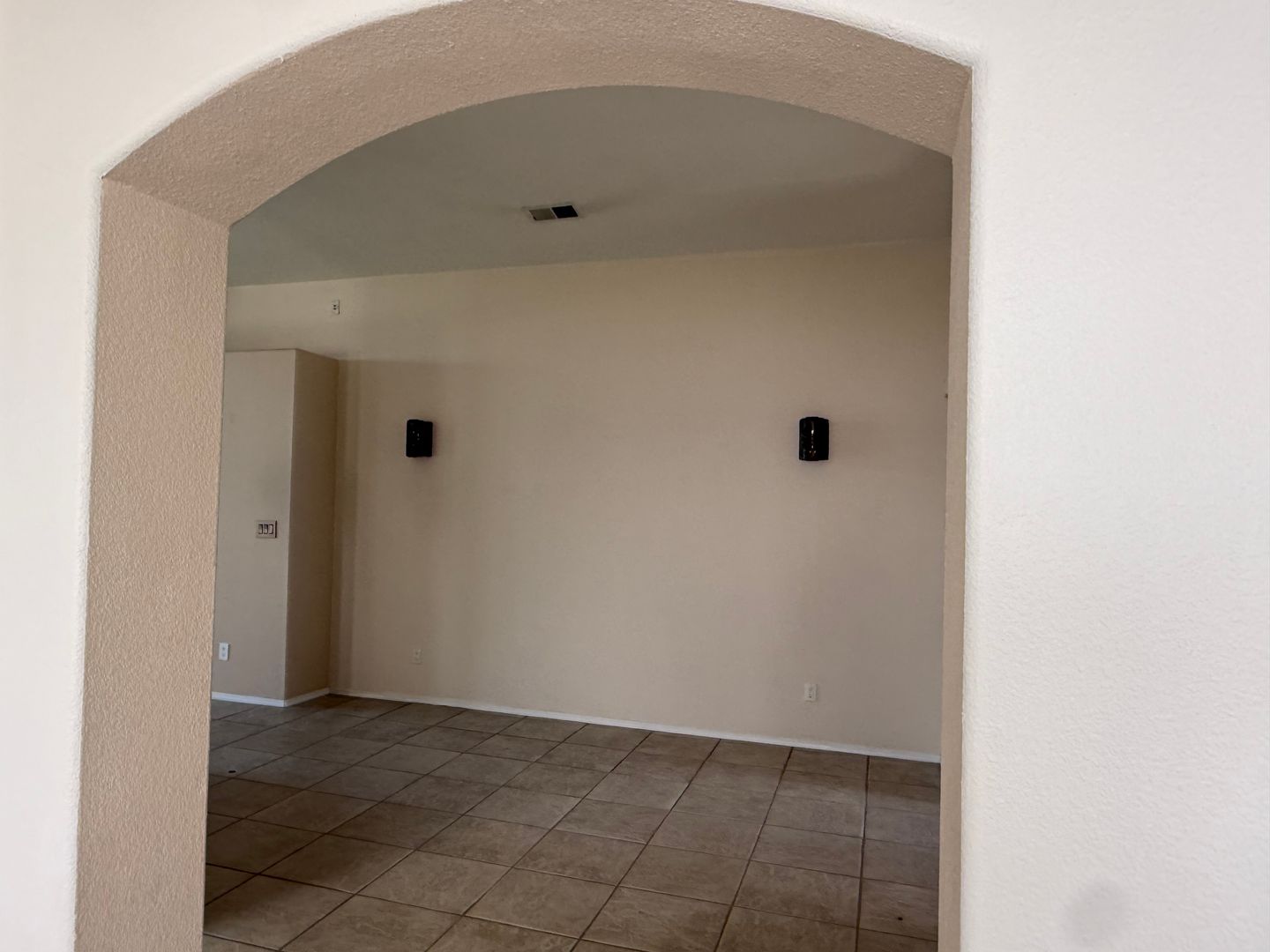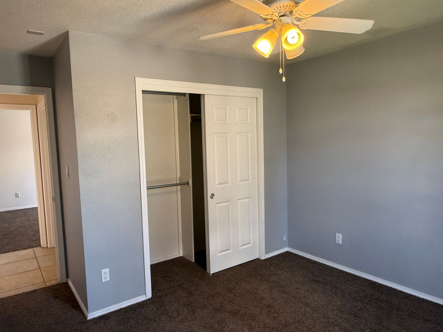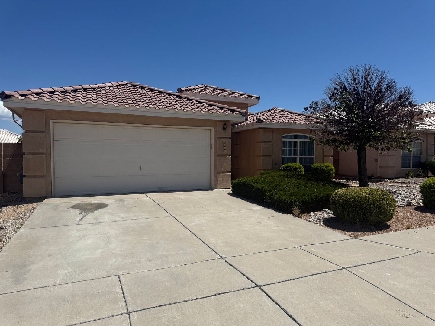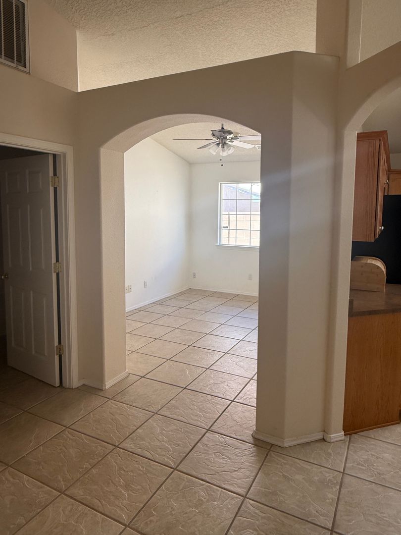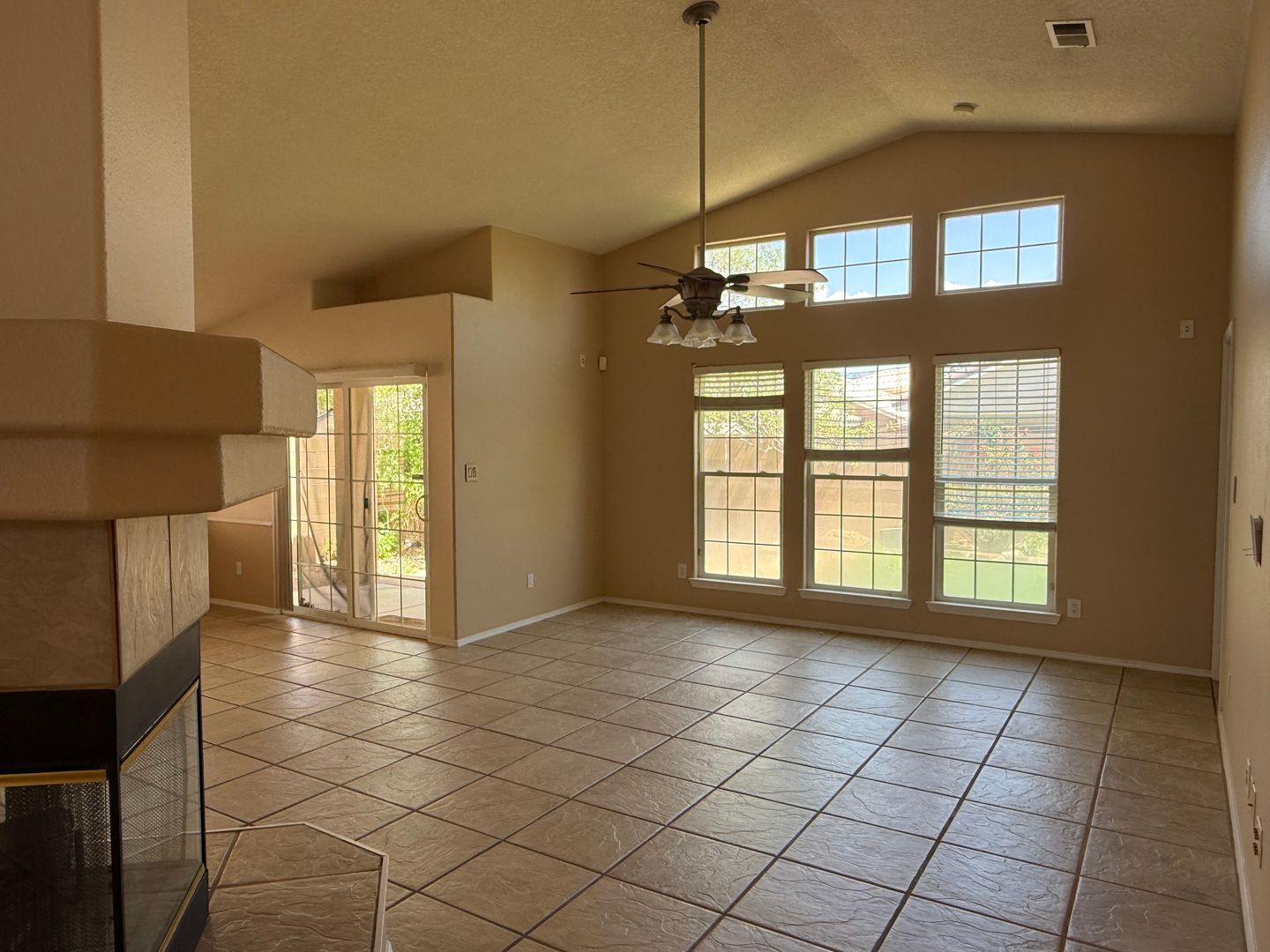 3BR / 2BA home with a 2-car garage, fireplace, and stainless-steel appliances. Features include a dining room, living room, and dedicated office space. Tile flooring throughout with carpeted bedrooms for comfort. The backyard has grass, and the front yard is landscaped, offering great curb appeal.