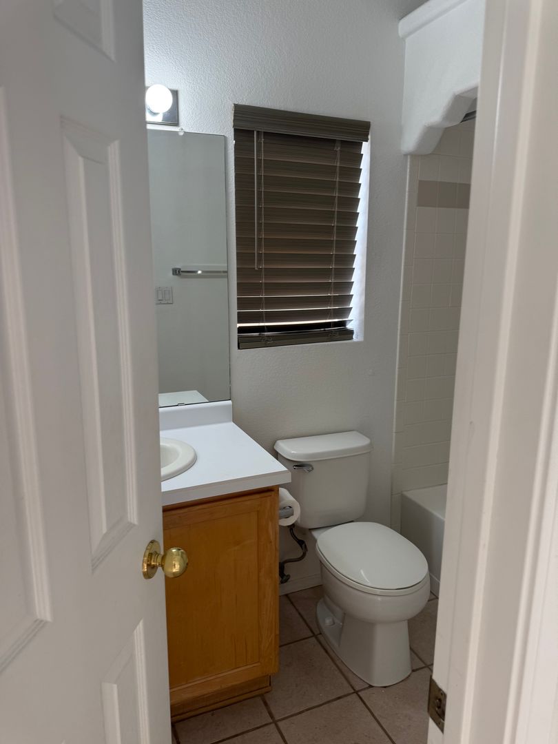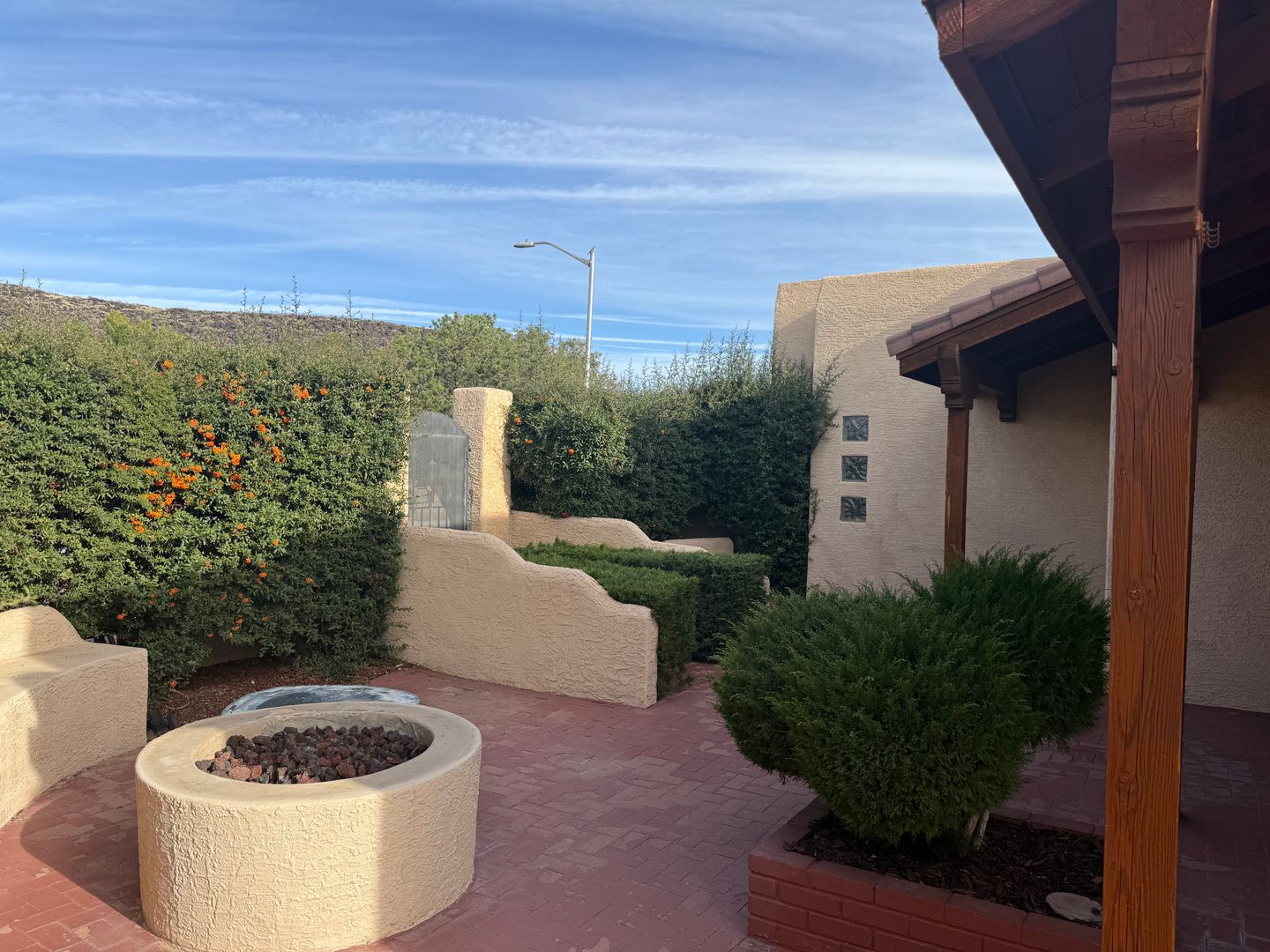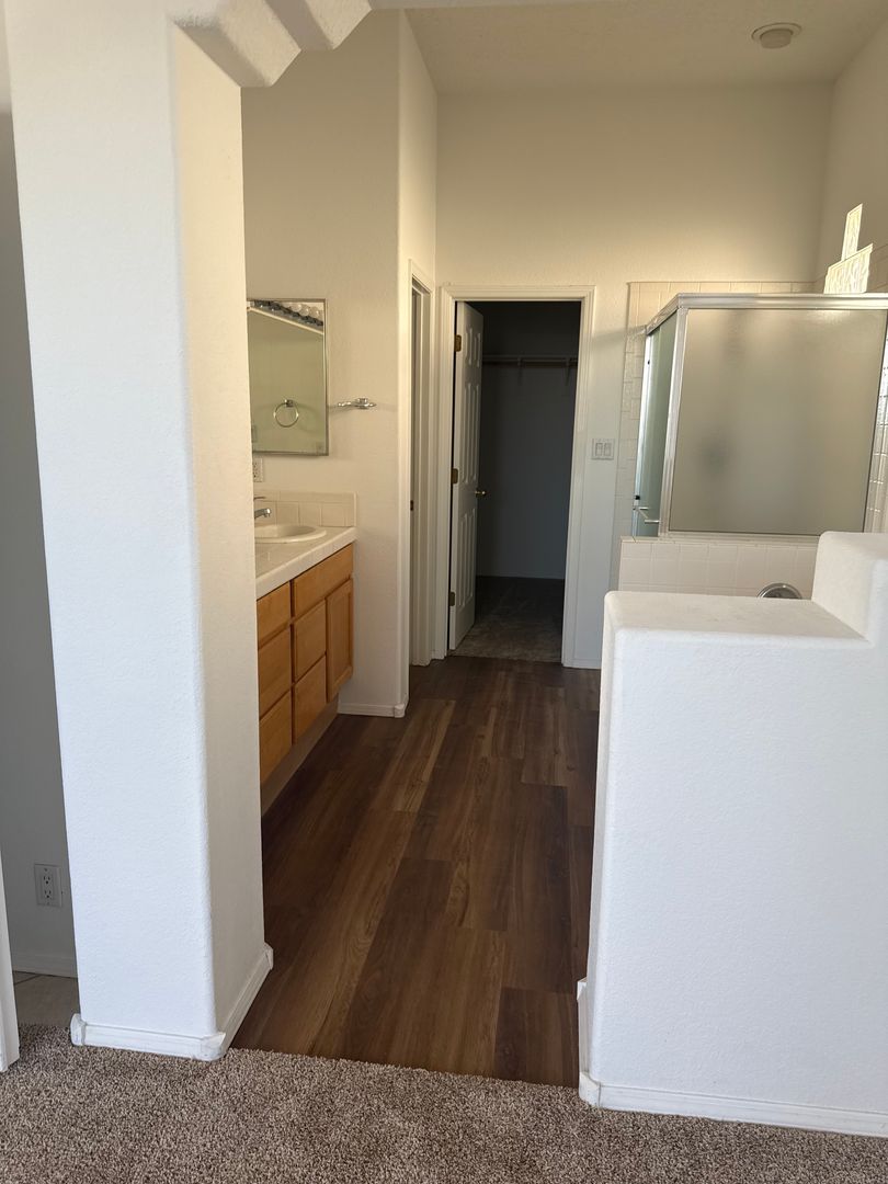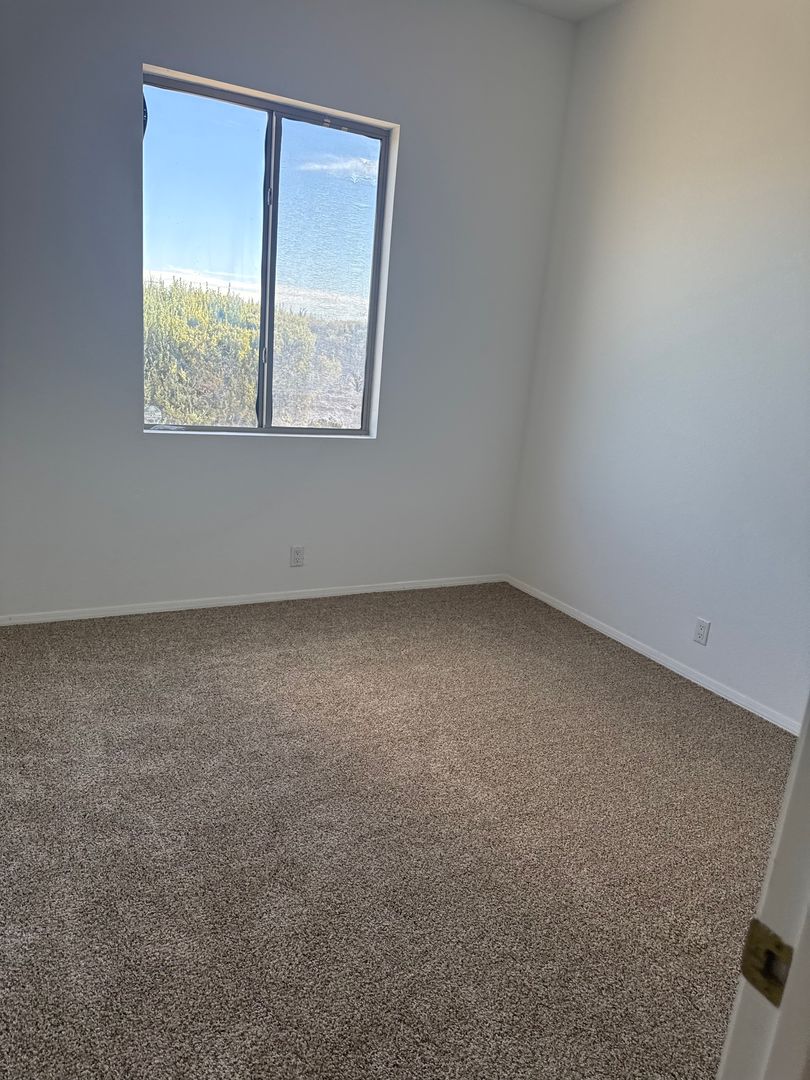 This property features three bedrooms, two bathrooms, a two-car garage, a fireplace, and a gated courtyard. It also includes an eat-in kitchen and a primary bedroom with double sinks. The property has new carpet throughout.